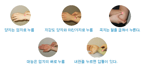 혈해 : 누르면 심한 압통이 있으며 엄지로 10회정도 누릅니다. (혈해는 다리를 잡는다는 기분으로 엄지로 누른다.)